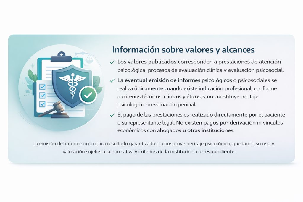 - La emisión del informe no garantiza la aprobación de licencias médicas, no constituye peritaje psicológico ni diagnóstico médico, y su uso y valoración quedan sujetos a la normativa y criterios de la institución correspondiente (COMPIN u otra autoridad administrativa).